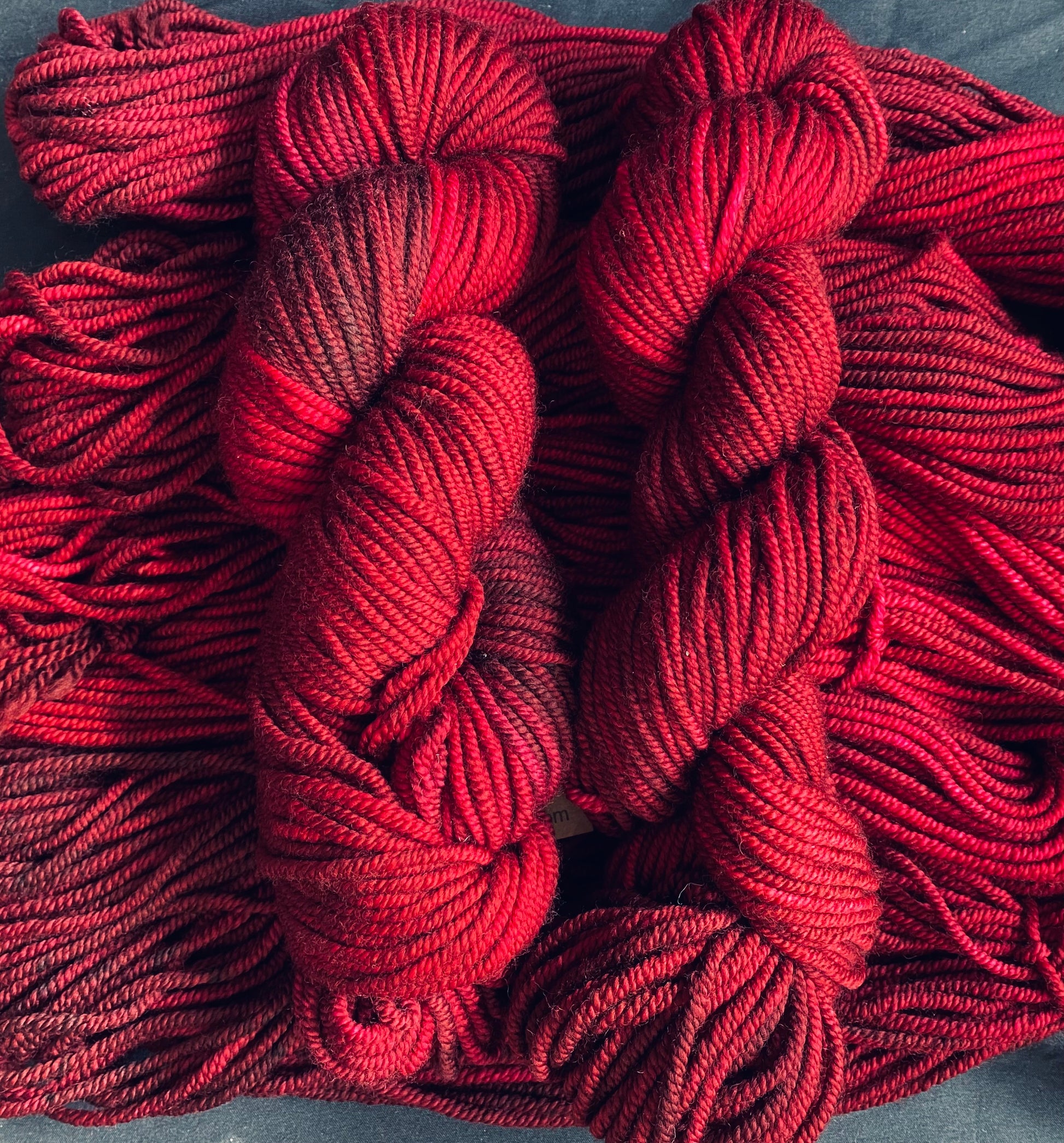 These skeins are dyed with a colour-way called Persephone's Kiss, a lush semi-solid which includes a highlight, midtone and undertone of rich Pomegranate.